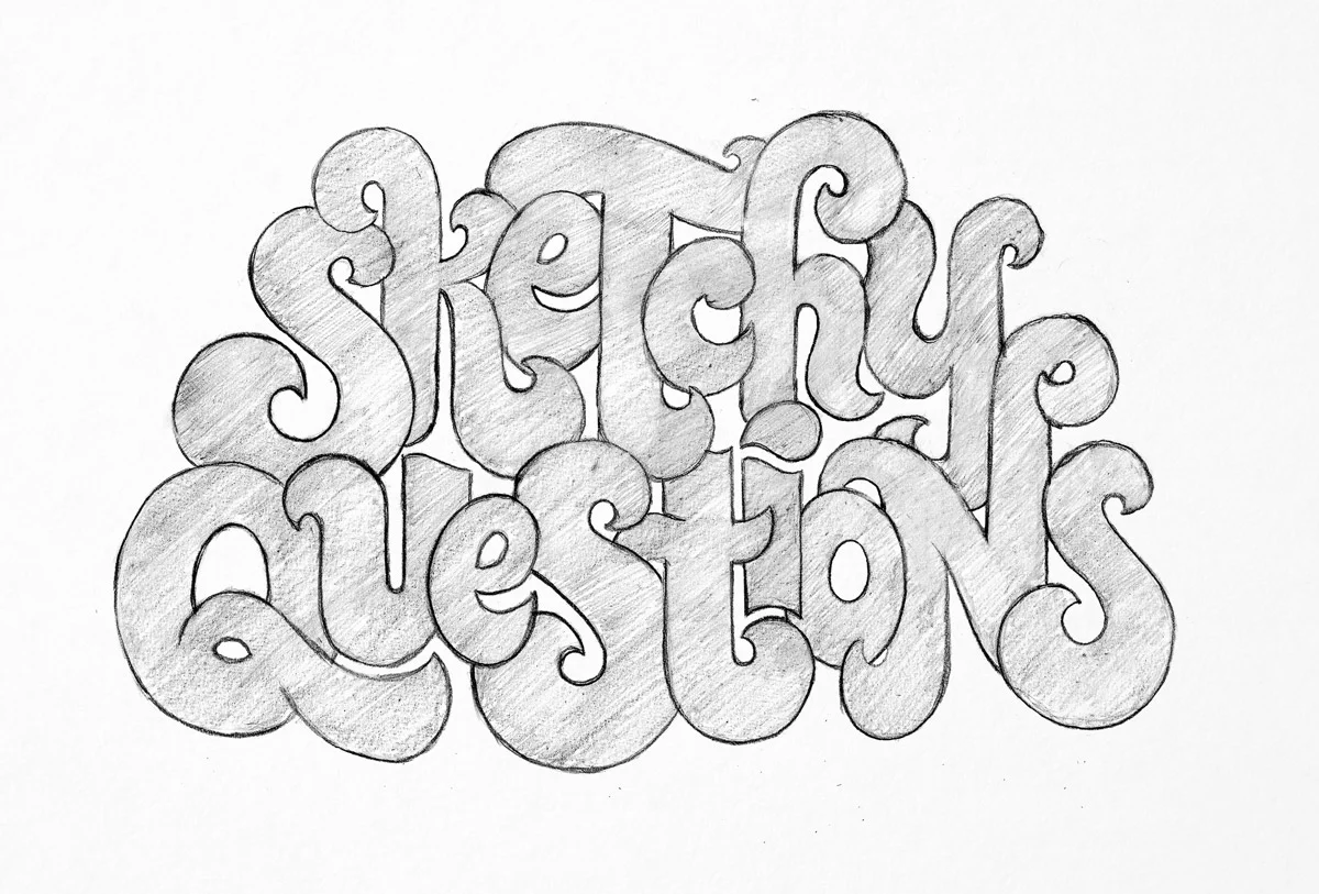 I think of a phrase, usually including four or more words, then scribble the words out approximately to scale (but not in a particular style yet) to play with compositional ideas. I am horrible at thumbnailing — I trust my eraser to deal with iterations. Usually, I’ll already have an idea for the style: that I want to do a script, or try a serif face, or keep the lettering simple but use a slew of really complicated swashes, etc. I’ll plunge into it with my pencil, always remaining mindful of the negative space and the overall shape of the piece, so I can reposition things on the go and figure out how big or small the next word should be. A period of intense drawing and erasing and evaluating ensues. Things are usually exciting all the way through; if I get bored or frustrated, it usually implies that I’ve veered from the spirit of the piece, and I start over.